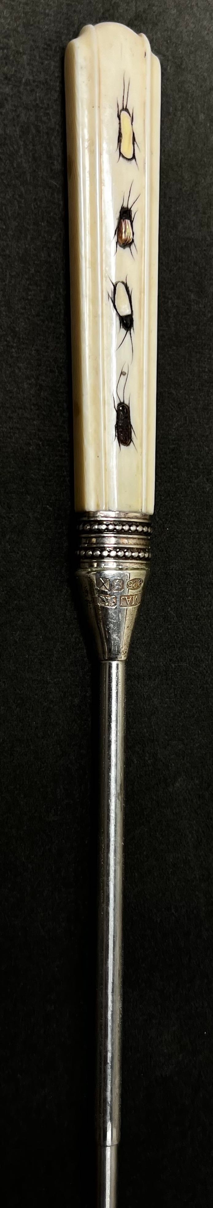 This rare hand carved bone and mother of pearl inlay insect adorned (called shibayama technique) made in Meiji period Japan with 925 sterling silver cuff tebori handle is now for sale. it comes with a set of three stainless steel, sterilisable tebori tips. two of the four insects show signs of wear.
